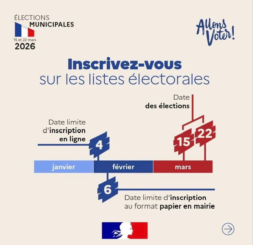 Si vous n’êtes pas encore inscrit sur les listes électorales, ne tardez pas ! Vous avez jusqu’au 4 février 2026 pour le faire sur internet et jusqu’au 6 février en mairie.