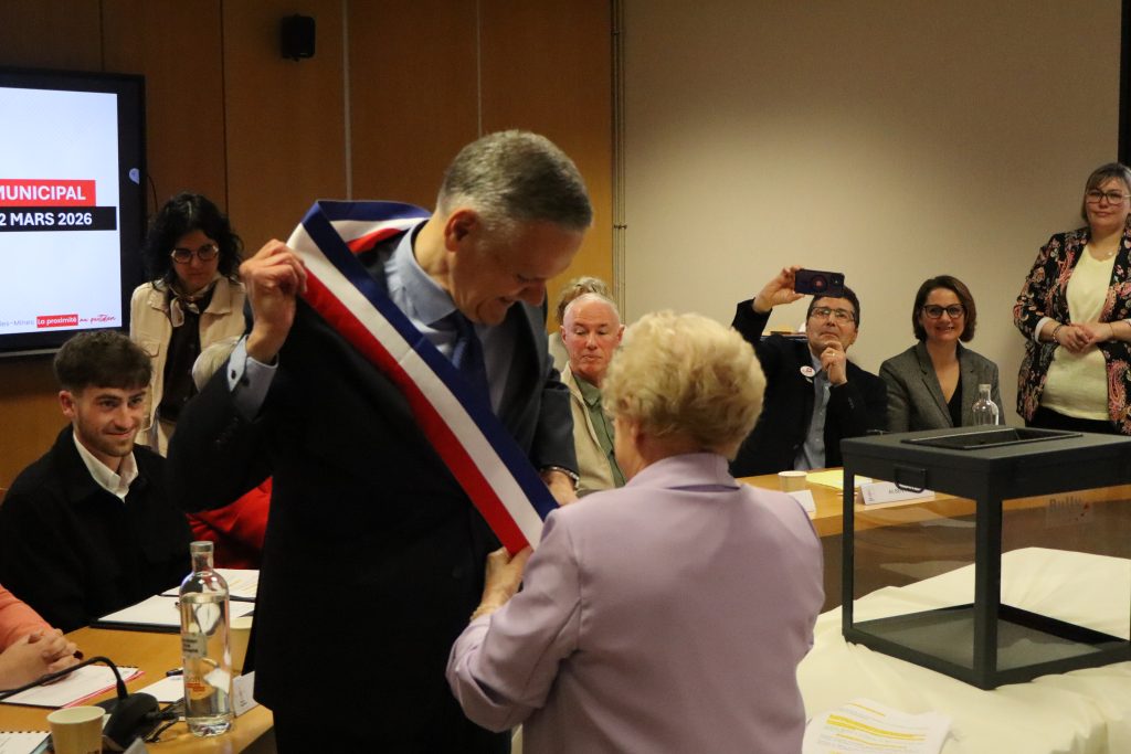 Madame Jeannine Pouchain, doyenne du Conseil, remet officiellement l’écharpe de Maire à Monsieur François Lemaire.