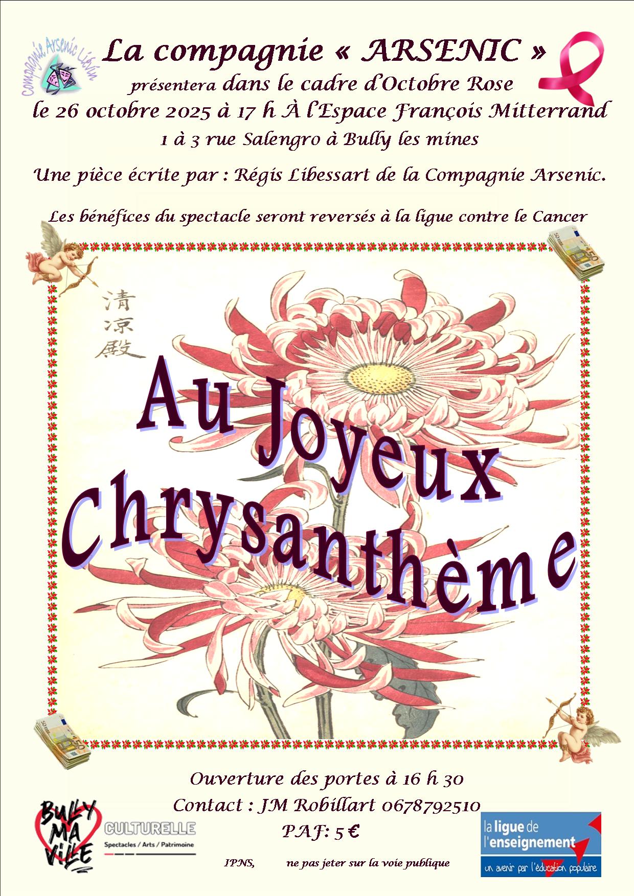 Tarif: 5 € (Hors Billetterie) / Infos et réservations: 06-78-79-25-10 Dans le cadre d’Octobre Rose, la compagnie Arsenic de Liévin, vous présente leur pièce de théâtre « Au Joyeux Chrysanthème ». . Ouverture des portes dès 16h30.